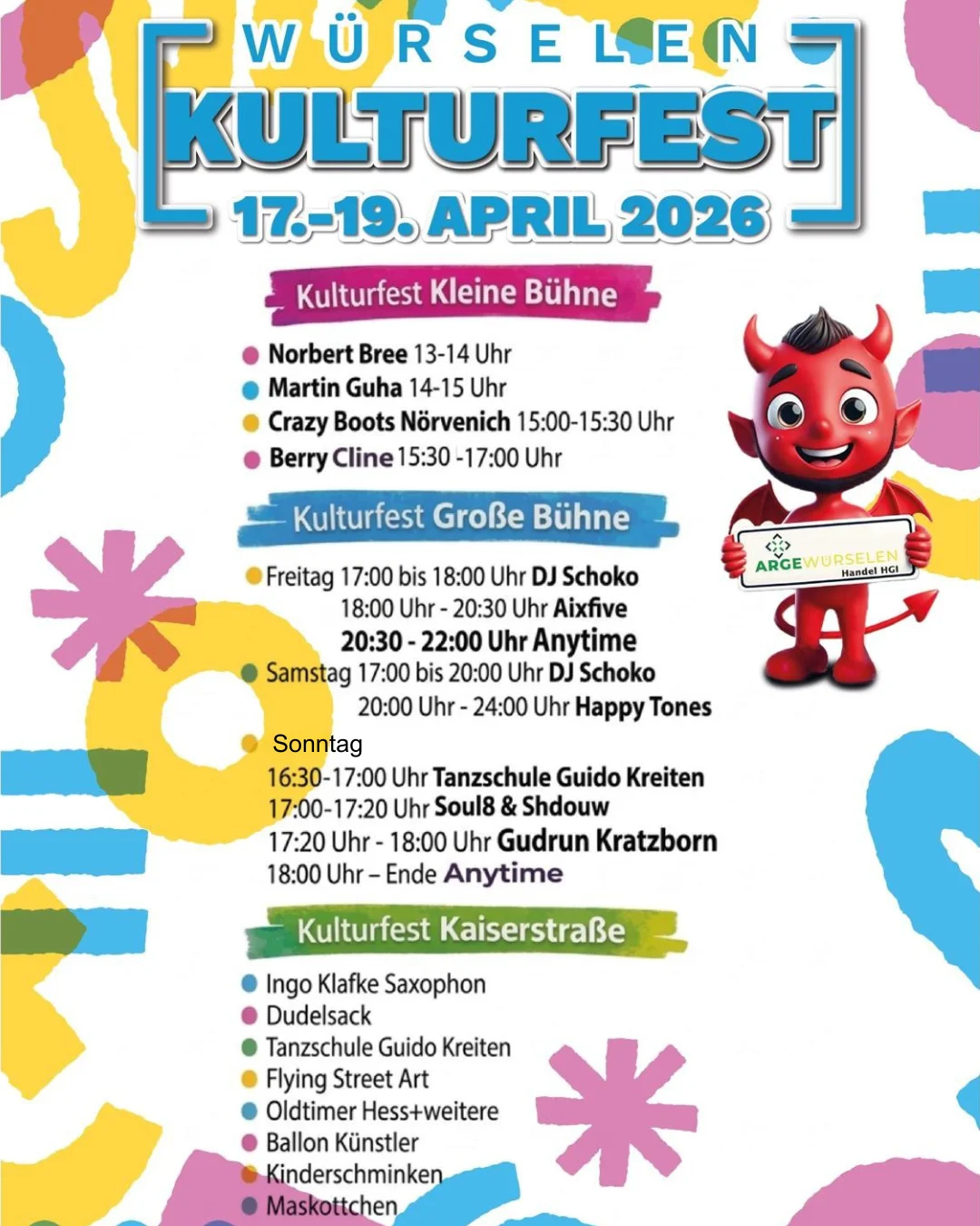 Vom 17.–19. April 2026 fin­det in Wür­se­len das dies­jäh­ri­ge Kul­tur­fest der ARGE statt — mit vie­len attrak­ti­ven Events im Zen­trum der Stadt.